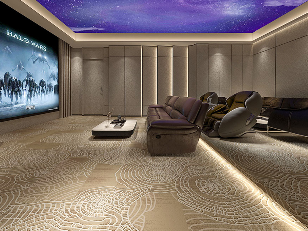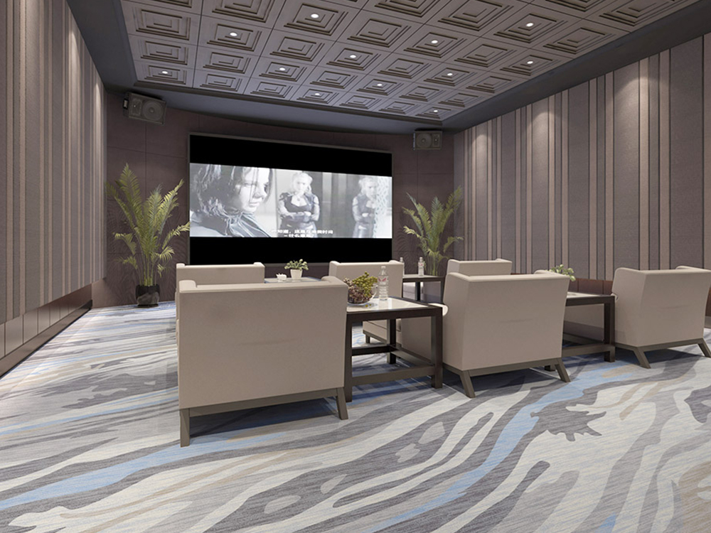 二、电影院地毯的作用 美观与主题表达:影院地毯常常采用与电影院主题相符合的图案和颜色,如经典电影元素、抽象图形等,为电影院增添艺术气息。 声音吸收:地毯可以有效吸收走动时的噪音,保证影厅内声音的清晰和环境的安静。 舒适与安全:地毯提供柔软的脚感,减少滑倒事故的风险!
